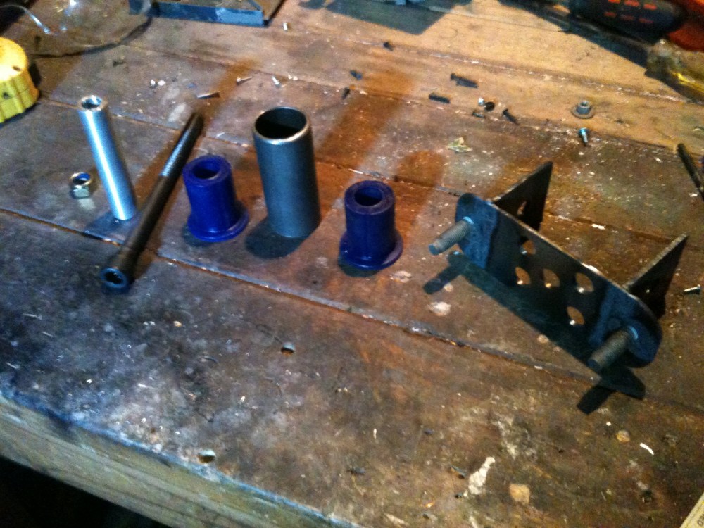 As for how these bits go together…. The larger bracket bolts to the gearbox with the studs. The purple poly pieces go inside the large tube. The alloy tube goes inside all of this. The bolt goes through the tabs on the main bracket, and through the alloy tube, locking it all together. The final piece of the puzzle – the larger tube will be welded onto the gearbox cross member, that is bolted to the shell of the car.
