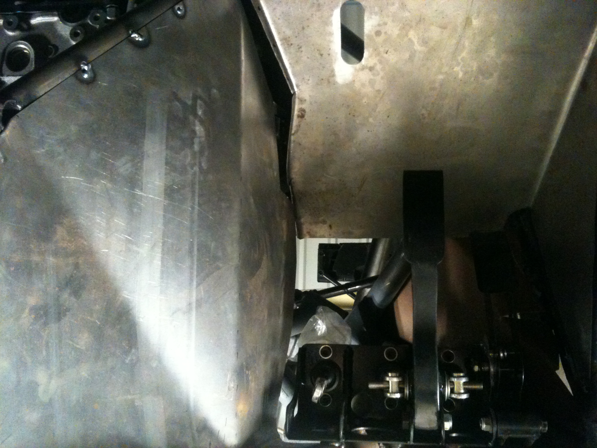 The oval slot, middle top in the pic, is for the steering column to pass through. The gap between the sheets, center of pic, will be filled with a separate panel that will run at an angle to the two sheets that are visible in this pic. This angled piece is to allow clearance for the intake on the engine, but to also keep enough room for the clutch pedal to be fully depressed (clutch pedal not attached in this pic.)