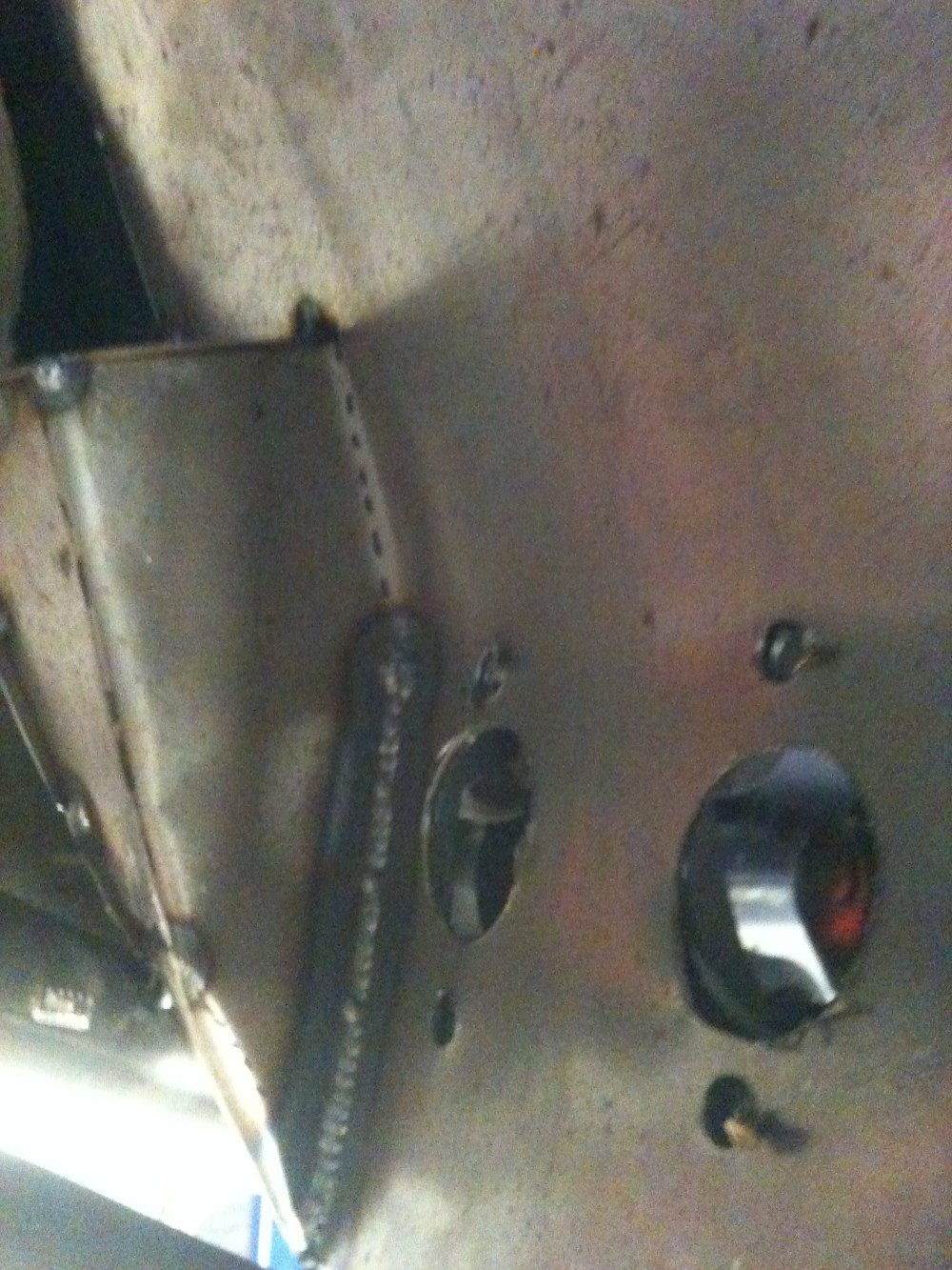 Once all the new panels were cut out they were all tacked into place into the car. Then I used the pedal box mount as a guide and drilled the matching holes through the panel – this is where the master cylinders will bolt back in, sealing this back up.