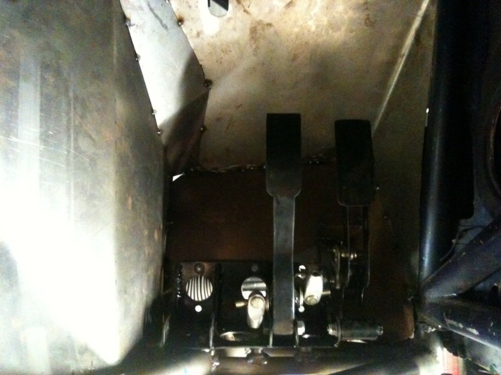 Then I had to remove the master cylinders from of the pedal box. Next was making up cardboard templates for the last few panels. I managed to get quite a complex shape in just two panels. The panel sits directly behind the pedal box, with a recess cut out behind the accelerator, to allow room for its linkages to move. You can see it in the pic below – taken from the other side of panel (ie. in the engine bay)