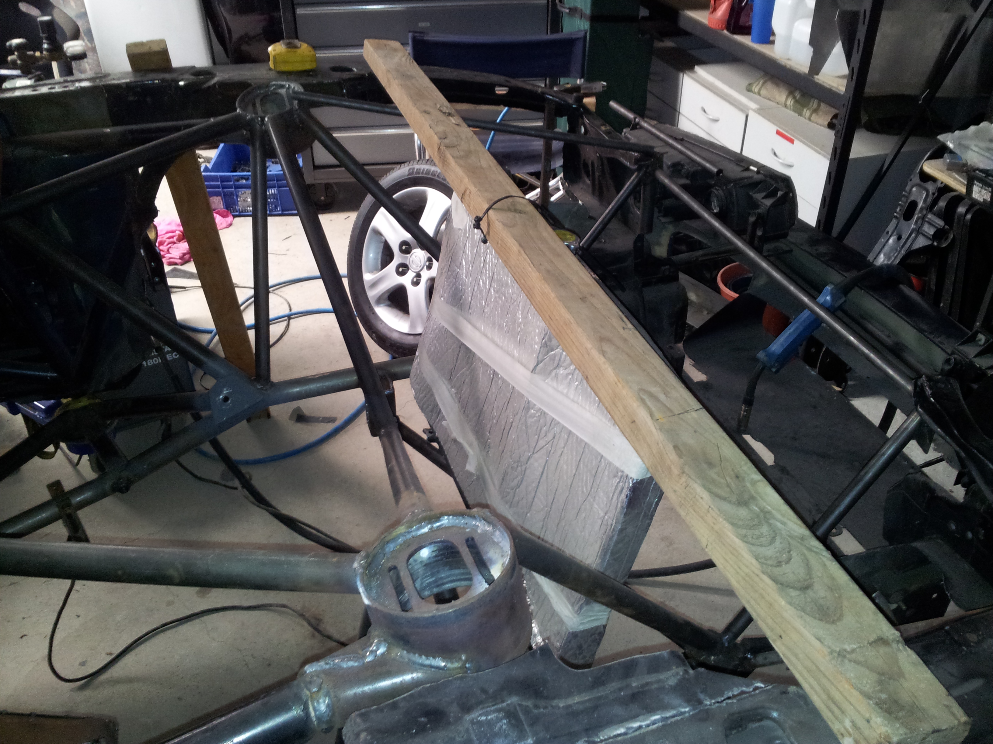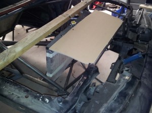 Mocking up of the radiator and intercooler positions (and yes, I have a wooden strut brace and a cardboard intercooler. These will be fine unless it rains :))