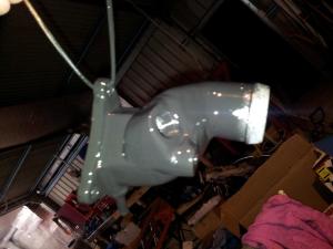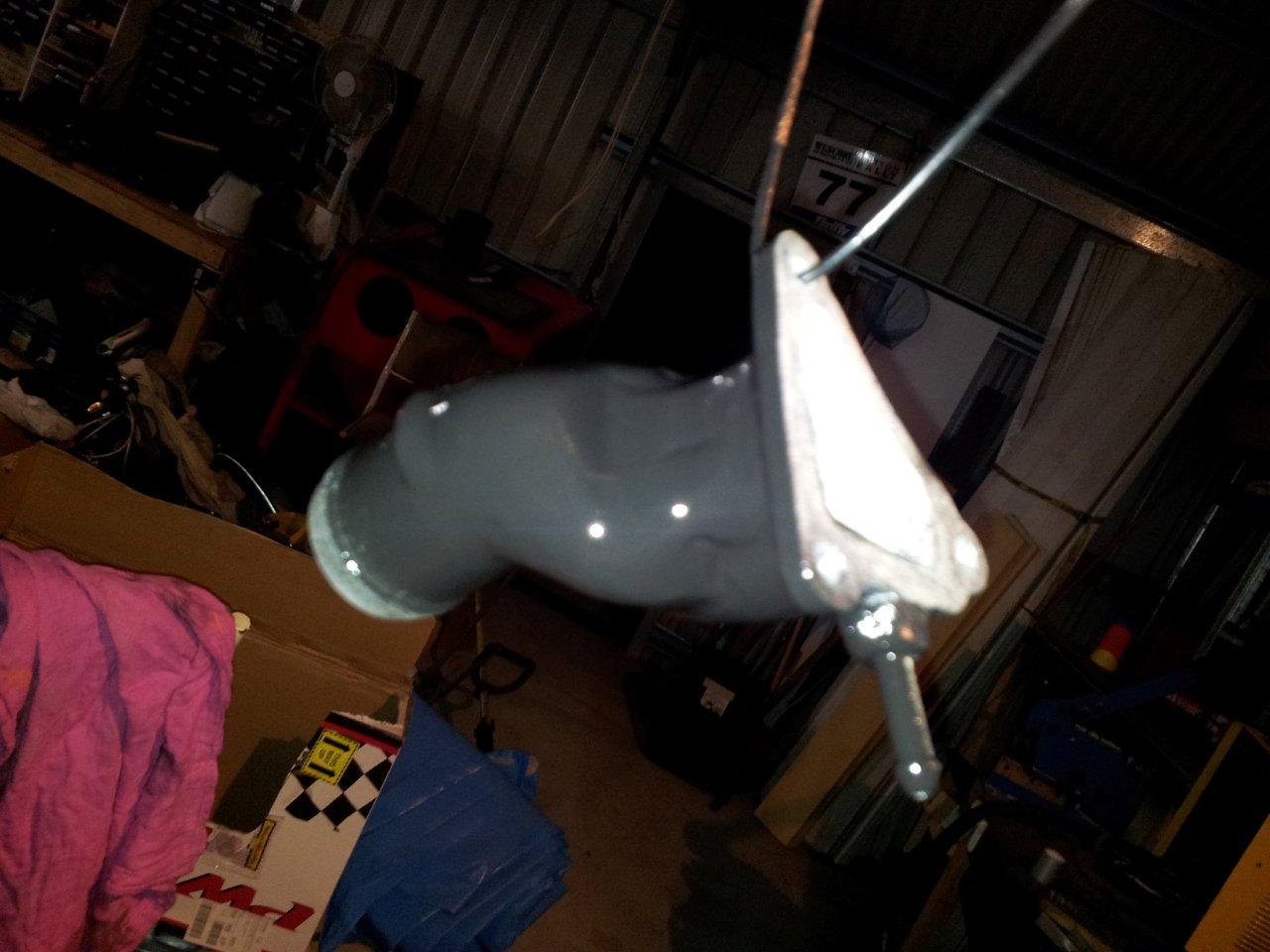 This weird looking thing is a combination of an S15 water outlet and an S13 water outlet that have been cut up and grafted back together in a completely different shape. The paint it still wet in this photo, hence the shine, but you get the idea of what a strange shape it had to be.
