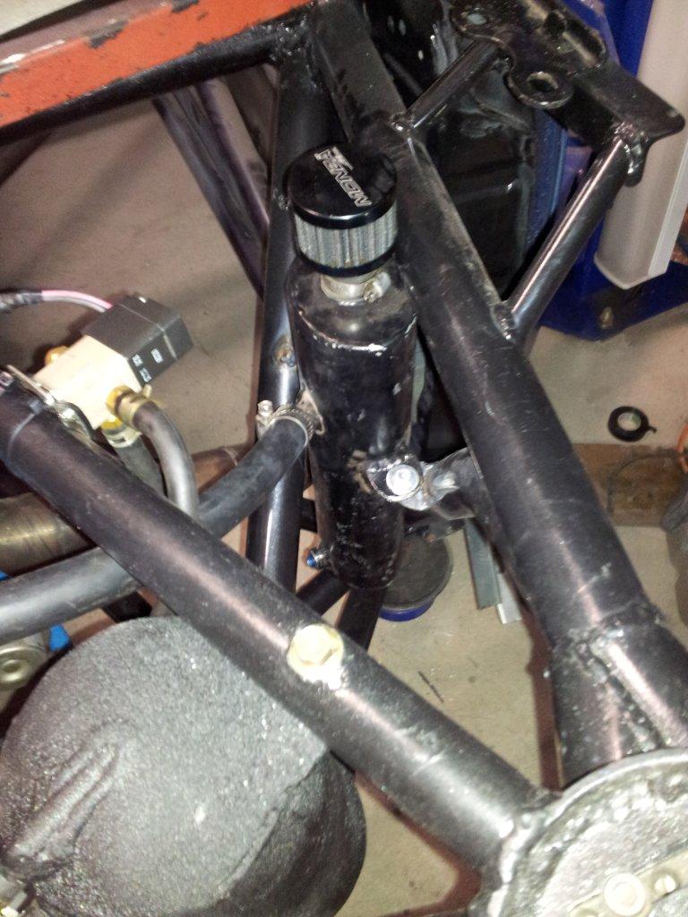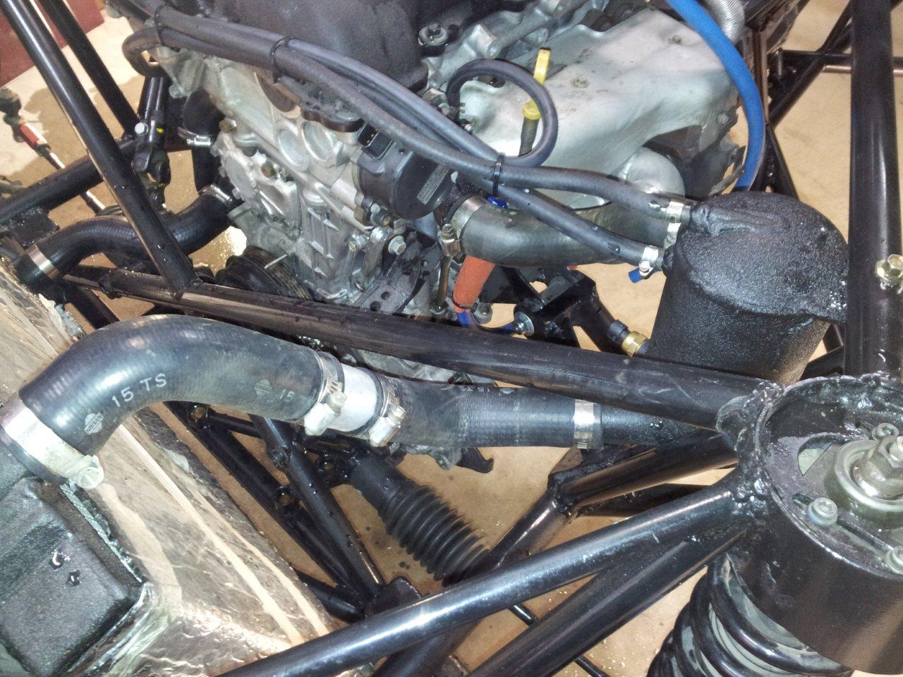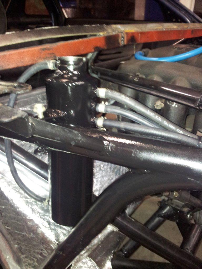 The top part of this tank will collect all of the air bubble that are produced in the coolant. Hopefully these will be drastically reduced with the electric water pump – the normal mechanical pumps can cause cavitation the pump at high RPM, putting air bubbles into the system (bad for cooling) and also robbing horsepower.
