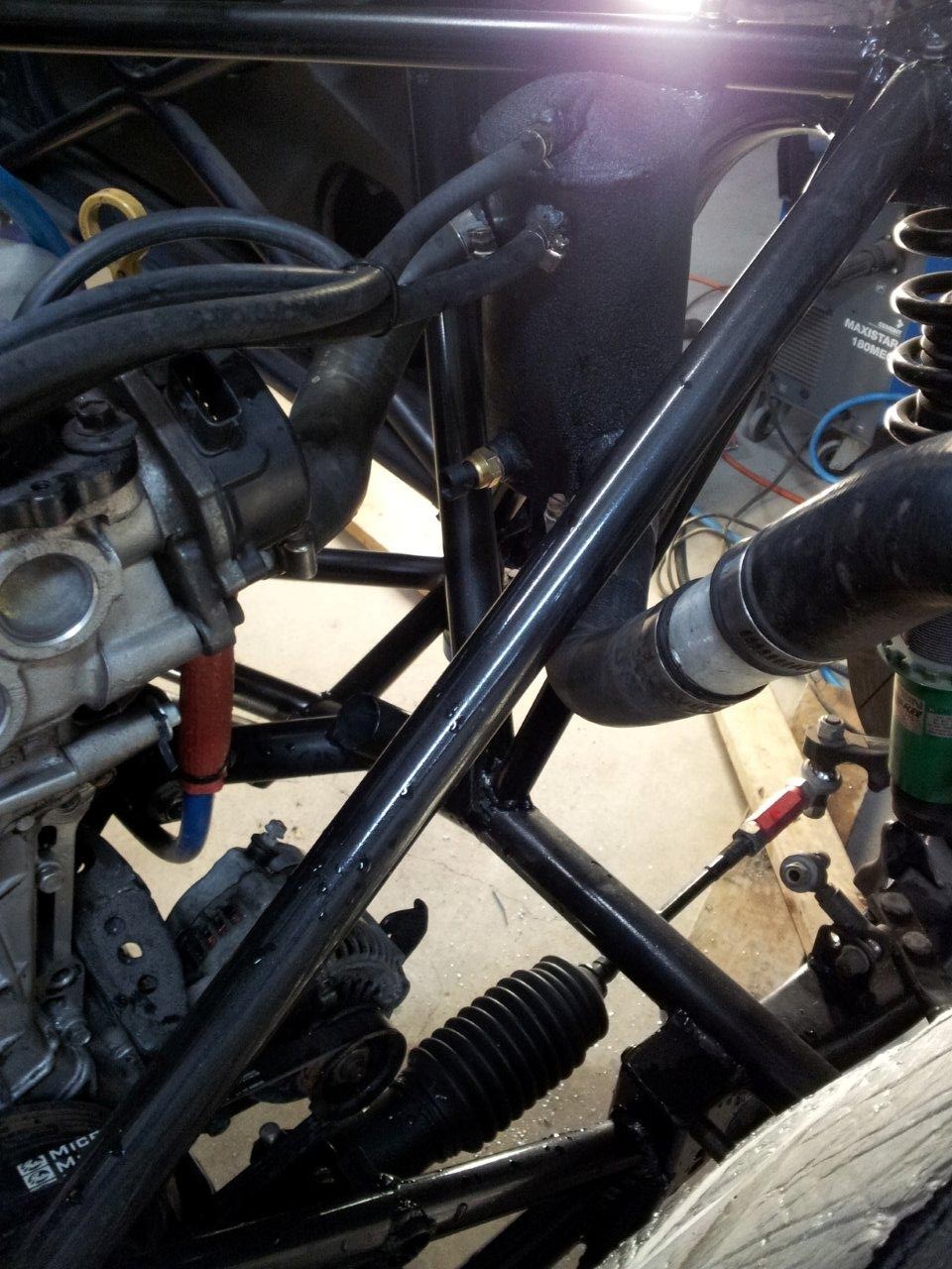 Last night I spent a lot of time making parts, but didn’t really make a lot of visible progress. In the same time that I took to bolt in the engine, gearbox suspension and steering, I made a couple of parts…