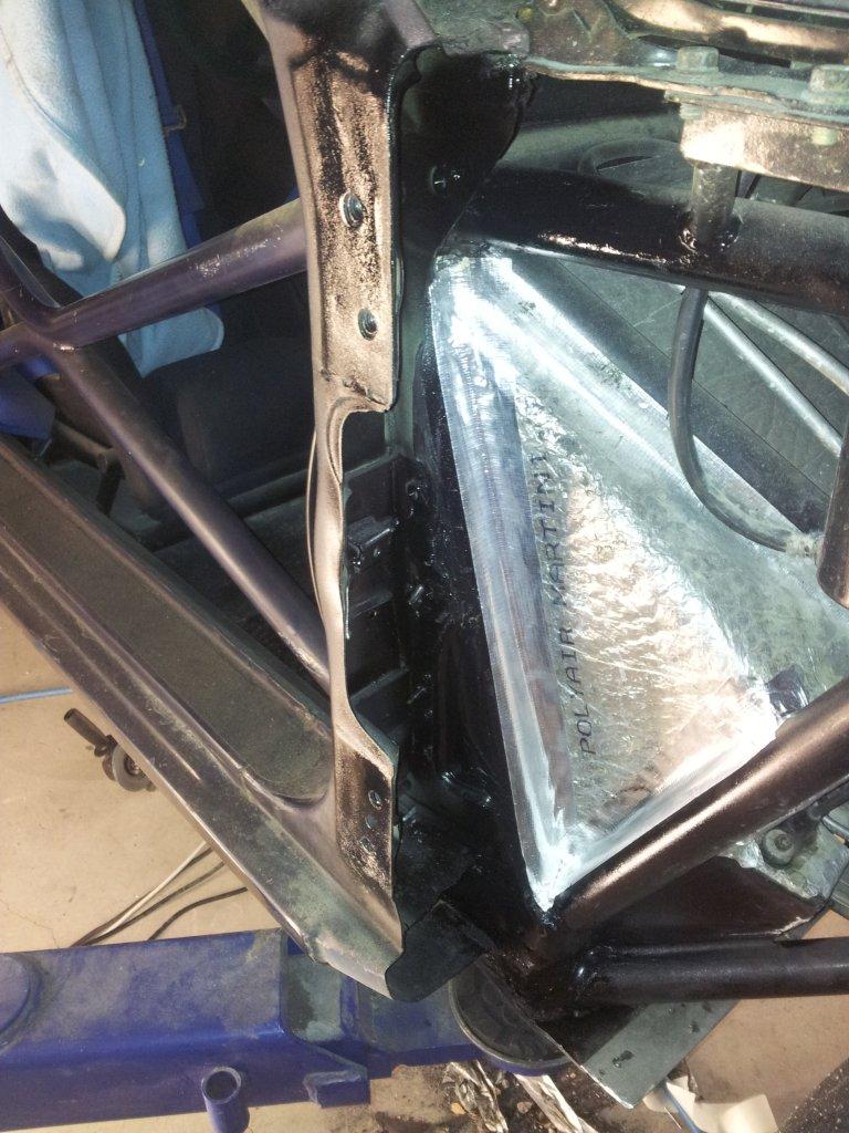 Next on the list was to make some improvements to the drivers door. One is due to the fact that I’ve cut so much out of it that its really floppy now, and doesn’t want to shut very well. The second one is to make it a little bit safer. While I know that its a bit late to have come to this realization, but my recent overnight trip to Sydney made me think out things a bit different. Sophie was very upset because I was not there to read her a story and say goodnight, and by the time that I got out of the presentation that I went to they were already asleep. I’ve never really worried about me dying, and I never really thought that the kids would miss me that much – I’m at work for most of the time that they are awake. So I guess as I’m more important to them (than I am to myself) I really need to spend some more time making the car as safe as it can be in an accident. So to stop the floppy door syndrome, and to make it safer in a side impact the door is now filled with 120mm thick foam across the whole door, and there is now an internal skin that is a lot more structural than the standard door trim. The idea is that in a side impact, the foam in the door crushing against the roll-cage will absorb some of the impact, rather than the metal skin of the door just instantly crushing. Hopefully I never have to test it out, but if I do, at least I’ve done all that I can to make it safer.
