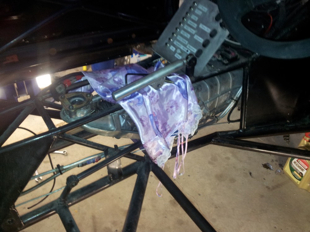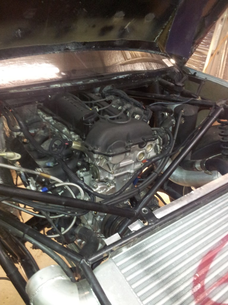 With the help of JC and Terry (thanks boys!) the chassis around the trans tunnel has been cut out, re-configured and welded back together. The engine and gearbox is now in and all bolted down.