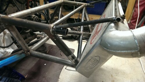After that it was finishing off the bar work at the front of the car. Two more bars have been added to the drivers side, which now completes the main chassis – next is welding on all of the brackets and mounts needed to hold everything else on.